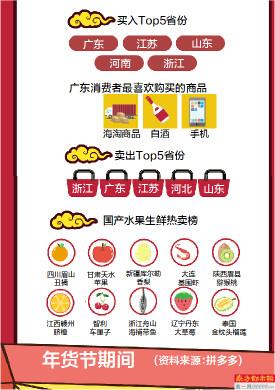 距离2020年春节还有不到一周,各大电商平台纷纷发布年货热销数据。和往年城乡消费层次分明不同的是,今年进口水果在电商平台“百亿补贴”之下呈现出加速下沉趋势,而国产的水果、生鲜等农产品则打破区域销售壁垒,受到一二线城市消费者欢迎。新电商平台拼多多最新发布的“年货节热卖榜”显示,年货节期间,以四川眉山丑橘、甘肃天水苹果、新疆库尔勒香梨为代表的国产农产品占据了水果生鲜榜的大半壁江山,进口产品则有智利车厘子、泰国榴莲等几大爆款上榜,在低线市场迅速渗透。从整体购买数据来看,位列买入前五的省份依次为广东、江苏、山东、河南、浙江,位列卖出前五的省份为浙江、广东、江苏、河北、山东。综合来看,一二线的农产品年货订单仍高达近7成,智利车厘子等进口水果在低线市场同比增幅逾400%。