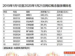 但要知道,网红概念股从2019年至今,势如破竹。据南都快消研究所不完全统计,自2019年1月1日至2020年1月21日,10只头部的网红经济概念股平均涨幅超130%。另据南都记者统计,1月2日至1月20日收盘,网红经济指数累计上涨7.7%,网络直播概念板块累计上涨6.8%,而上证指数累计上涨1.5%。很显然,2020年至今,网络直播概念板块都远远跑赢大盘。