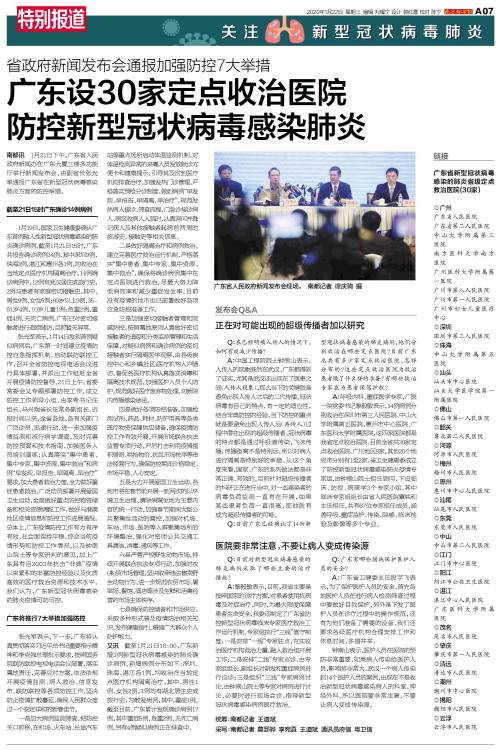广东设30家定点收治医院防控新型冠状病毒感染肺炎