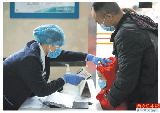 医护人员为就诊者分诊测量体温。
