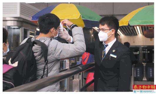 汤行路为进站旅客测量体温。 南都记者 代国辉 摄