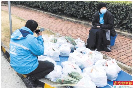南都记者发现,盒马杨箕配送点,确实是周围最繁忙的场所,一袋袋米、一箱箱水不断从这里往外发,聂宛双拿着酒精棉球,不断让进出的各位消毒。而旁边的生活超市,只有2个顾客在选购商品,他们对面的一家卖生鲜产品的实体店因为没生意而打烊了。
