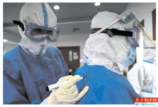 中山三院护理科护师张晓玲在队友海秀的防护服肩膀上画了个带笑脸的太阳。 南都记者 赵明 摄