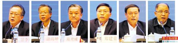 28日,广东省人民政府新闻办举行每日疫情防控例行新闻发布会,省教育厅厅长景李虎、省工业信息化厅厅长涂高坤、省人力资源社会保障厅厅长陈奕威、省商务厅厅长郑建荣、省市场监管局局长麦教猛、省卫生健康委副主任陈祝生(左至右)现场答记者问。