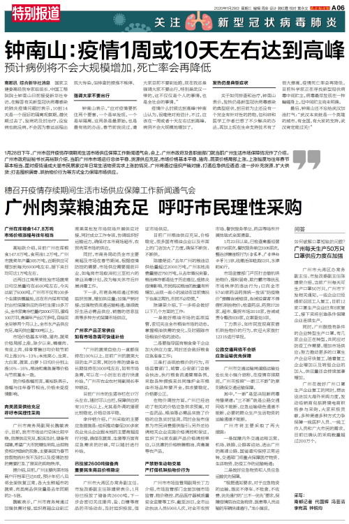 1月28日下午,广州市召开疫情存续期间生活市场供应保障工作新闻通气会。会上,广州市政府及各职能部门就当前广州生活市场保障情况作了介绍。广州市政府副秘书长高裕跃介绍,当前广州市市场运行总体平稳,货源供应