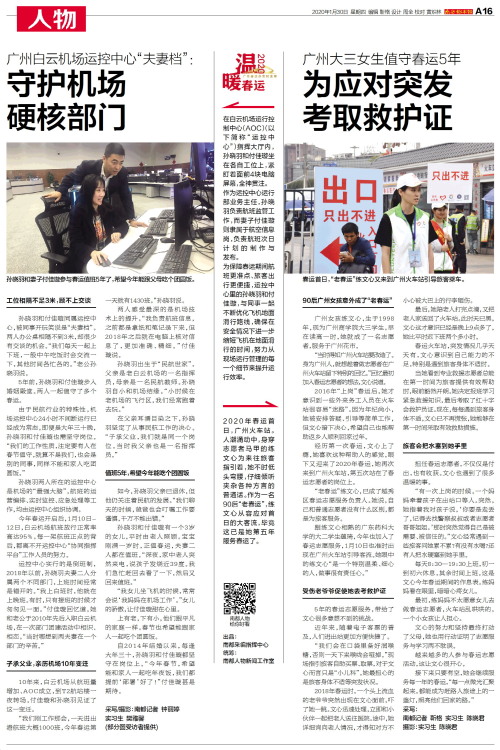 2020年春运首日,广州火车站。人潮涌动中,身穿志愿者马甲的练文心为来往旅客指引着,她不时低头弯腰,仔细倾听夹杂各种方言的普通话。作为一名90后“老春运”,练文心从容应对首日的大客流,毕竟这已是她第五