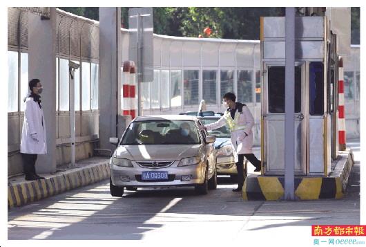 机场高速黄石路出口只留一条通道,每个通过的人都要测体温。南都记者 张志韬 摄