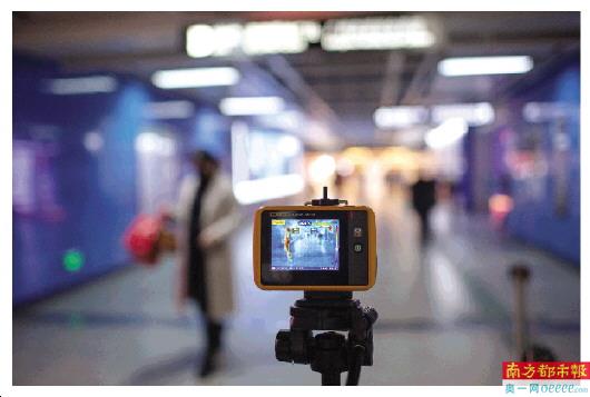 1月30日下午,珠江新城地铁站入口,红外体温测试仪对准着即将进站的乘客。南都记者 钟锐钧 摄
