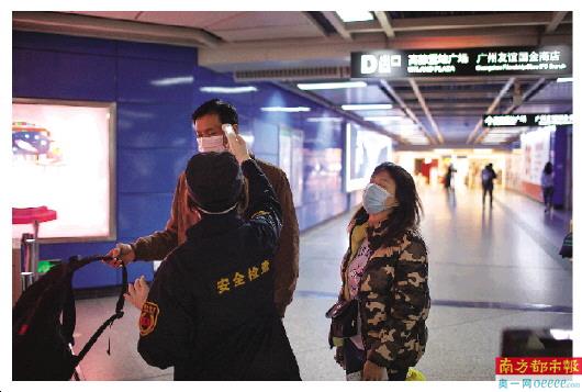 1月30日下午,珠江新城地铁站入口,安检员对进站的市民单独测量体温。南都记者 钟锐钧 摄