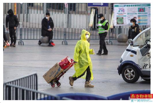 1月30日下午,广州火车站广场,一名出站的旅客穿上了黄色雨衣。南都记者 谭庆驹 摄