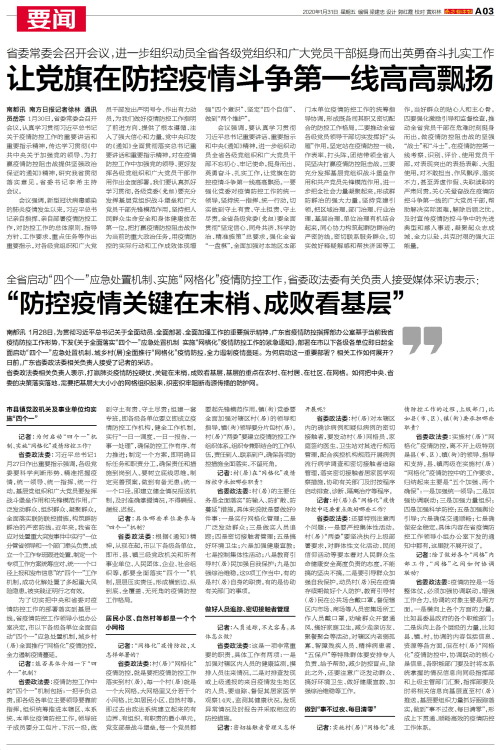 南都讯 南方日报记者徐林 通讯员岳宗 1月30日,省委常委会召开会议,认真学习贯彻习近平总书记关于疫情防控工作的重要讲话和重要指示精神,传达学习贯彻《中共中央关于加强党的领导、为打赢疫情防控阻击战提供
