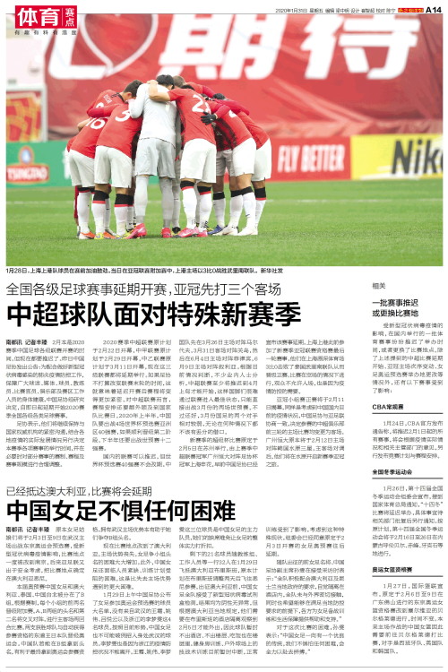 南都讯 记者丰臻 2月本是2020赛季中国足球各级联赛开赛的时间,但现在都要推迟了。昨日中国足协发出公告:为配合做好新型冠状病毒感染的肺炎疫情防控工作,保障广大球迷、媒体、球员、教练员、比赛官员、俱乐