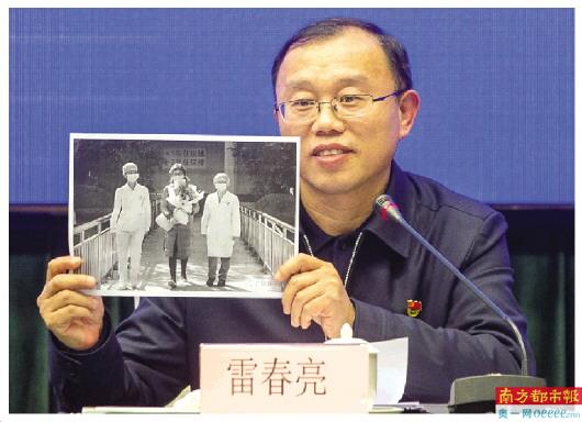 1月31日下午,发布会上,广州市第八医院院长雷春亮向现场媒体记者展示30日上午广州第一例治愈的确诊患者出院时的照片。 南都记者 谭庆驹 摄