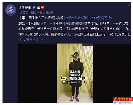 1月27日,湖南省长沙市公安局开福分局通报,一男子在长沙五一广场地段,手持自己身份证(户籍地为湖北省)自拍称“我刚从湖北武汉来的,要来祸害别人”。该视频迅速在网上热传,引起不少网友担忧,并向公安机关报警。经查,该男子周某,22岁,户籍地为湖北省石首市。周某与父母长期在长沙务工,其自2019年10月6日后一直未离开长沙。1月26日下午周某出于“纯属好玩和娱乐”的目的,拍摄并发布了这段视频。1月27日,长沙开福警方依法对违法行为人周某予以行政拘留5日。