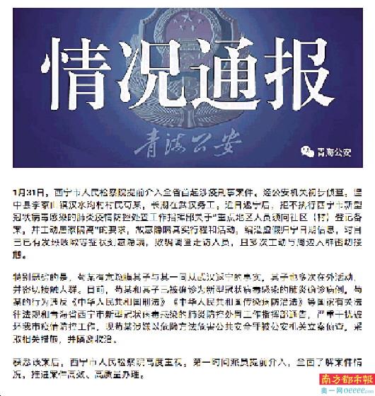 1月31日,青海公安对确诊病例苟某以涉嫌以危险方法危害公共安全罪立案侦查。这是该省首起涉疫刑事案件,检方已提前介入。