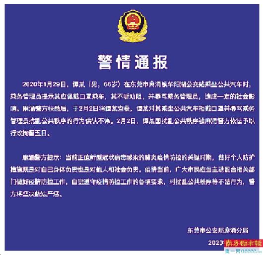 此外,近日江苏省无锡市锡山区云林街道对9名拒不服从居家隔离有关规定者实施强制隔离措施;一对湖北籍夫妇前往广东汕头澄海后出现发热、咳嗽等症状,知情人及当事人均不主动上报,后一人确诊,当地警方对相关四人以涉嫌以危险方法危害公共安全罪予以立案侦查;广东东莞麻涌一男子不听劝阻拒不佩戴口罩并辱骂乘务管理员被当地警方行政拘留五日……