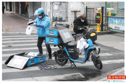 2月5日,广州南洲北路,外卖员送餐到小区门口。 南都记者 何玉帅 摄