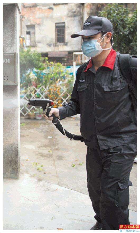 ↓2月4日,广州市越秀区华侨新村,消杀队对楼道消毒。 南都记者 梁炜培 摄