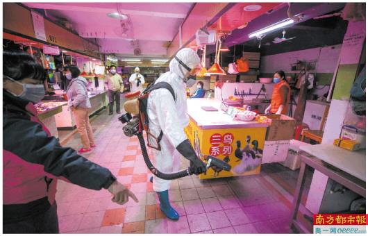 2月4日下午,广州荔湾区金花街道消毒站的工作人员在中午菜市场休市的间隙对金花直街的菜市场进行消杀,菜市场的管理人员特别要求其对三禽档口喷洒。据介绍,该街道一共有12个社区、4个菜市场和9个公共厕所,消毒站的7名工作人员从1月20日至今一直无休每天工作10小时,对辖区内的广场、菜市场和公共厕所等重点区域进行消杀。 南都记者 谭庆驹 摄