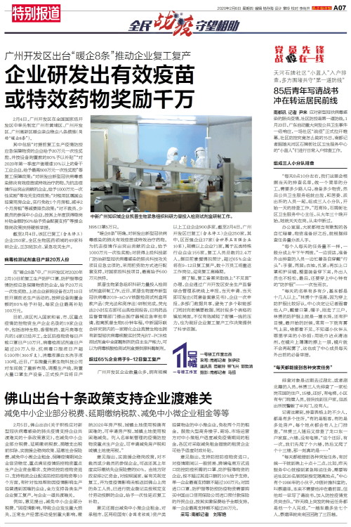 2月4日,广州开发区在全国国家级开发区中率先制定广州市黄埔区、广州开发区、广州高新区暖企亲企稳企八条措施(简称“暖企8条”)。其中包括“对提前复工生产疫情防控应急保障物资的企业给予20万元一次性奖励,