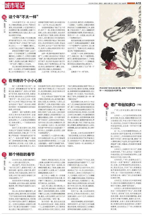 城记 陈丹纯 广州今年的春节不太一样。往年过年,开着车满地跑。但今年,气氛有点紧张,到处很安静。小区里的梅花兀自寂静地开着,粉粉嫩嫩,丝毫不介意只有稀稀拉拉的人路过,甚少人会抬头察觉它的美。它