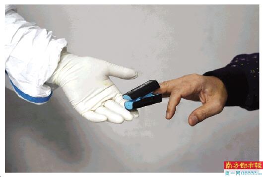 广东医疗队的医务人员给患者测试血氧饱和度。