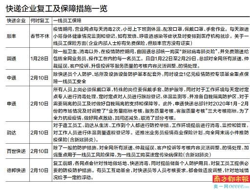 中国物流学会特约研究员杨达卿指出,今年快递企业复工日期跟往年基本一致,但由于受疫情影响,快递企业不同地区、不同网点实际复工率或低于以往。由于存在心理恐慌,部分区域交通受阻,人员隔离限制三个因素叠加,造成农村劳动力的返工难。估计快递、外卖等劳动密集型物流服务全面正常化要到2月底3月上旬。同时,南都记者注意到,针对近期部分地区出现限制和阻止邮政、快递车辆通行导致寄递服务不能正常开展的问题,2月8日交通运输部、国家邮政局和中国邮政集团公司联合印发紧急通知,明确对执行应急物资运输任务的邮政、快递车辆落实“不停车、不检查、不收费”政策,保障车辆优先便捷通行。
