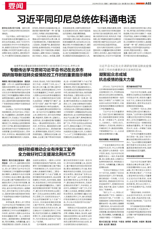 新华社北京2月11日电 国家主席习近平11日晚应约同印尼总统佐科通电话。习近平指出,当前中国正处于抗击新冠肺炎疫情的重要关头,总统先生同我通话,体现了印尼作为全面战略伙伴对中方的情谊和支持,感谢印尼朋