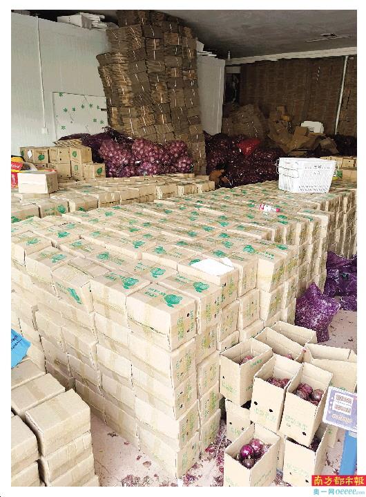 3. 王耀忠的仓库内堆放着打包好的洋葱。