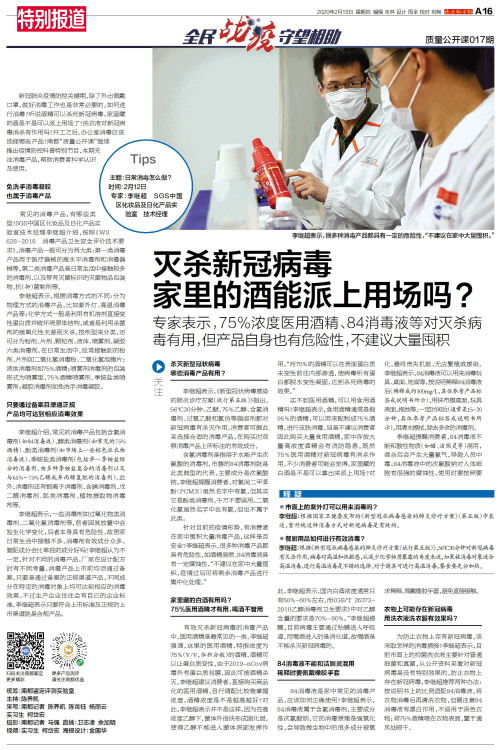 质量公开课017期 Tips主题:日常消毒怎么做?时间:2月12日专家:李继超 SGS中国区化妆品及日化产品实验室 技术经理新冠肺炎疫情防控关键期,除了外出佩戴口罩,做好消毒工作也是非常必要的。