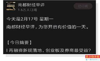 2月17日早上,南都财经早评提醒投资者,证监会再融资新规提升资本市场的融资功能,提高上市公司融资效率,对市场刺激比较大。当日,两市股指高开高走,创业板指盘中大涨逾4%,刷新三年新高。券商指数大涨5%,板块内所有股票飘红。国金证券涨停,国元证券、东吴证券上涨超过8%。