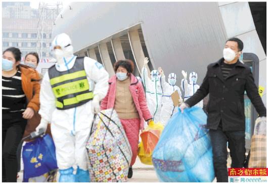 3月1日下午,武汉客厅方舱医院132人出院,是迄今为止该院最大规模出院。方舱内,一批接一批的治愈者在医护人员陪同下,提着行李从方舱中陆续走出,挥手向医护人员道别。治愈者最小年龄19岁,最大年龄75岁。目前,该方舱已累计出院587人。 南都特派记者 刘有志 摄