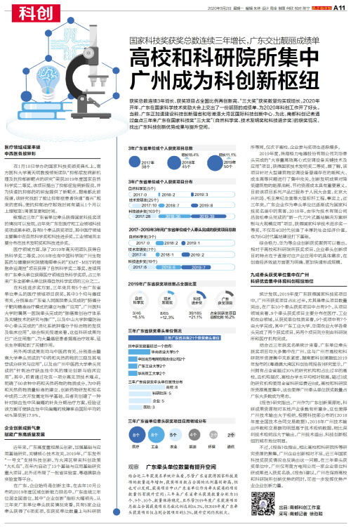 获奖总数连续3年增长、获奖项目占全国比例再创新高、“三大奖”获奖数量均实现增长。2020年开年,广东在国家科学技术奖励大会上交出了一份靓丽的成绩单,为2020年科创工作开了好头。当前,广东正加速建设科