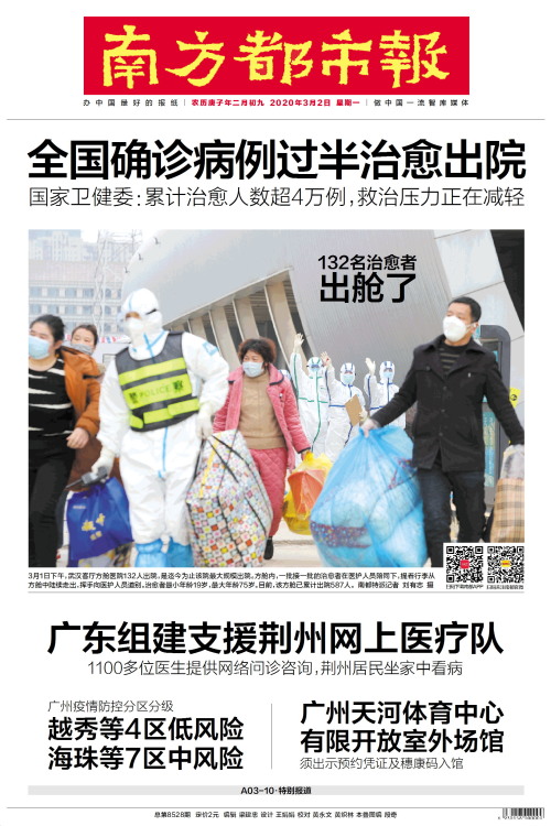 3月1日下午,武汉客厅方舱医院132人出院,是迄今为止该院最大规模出院。方舱内,一批接一批的治愈者在医护人员陪同下,提着行李从方舱中陆续走出,挥手向医护人员道别。治愈者最小年龄19岁,最大年龄75岁。