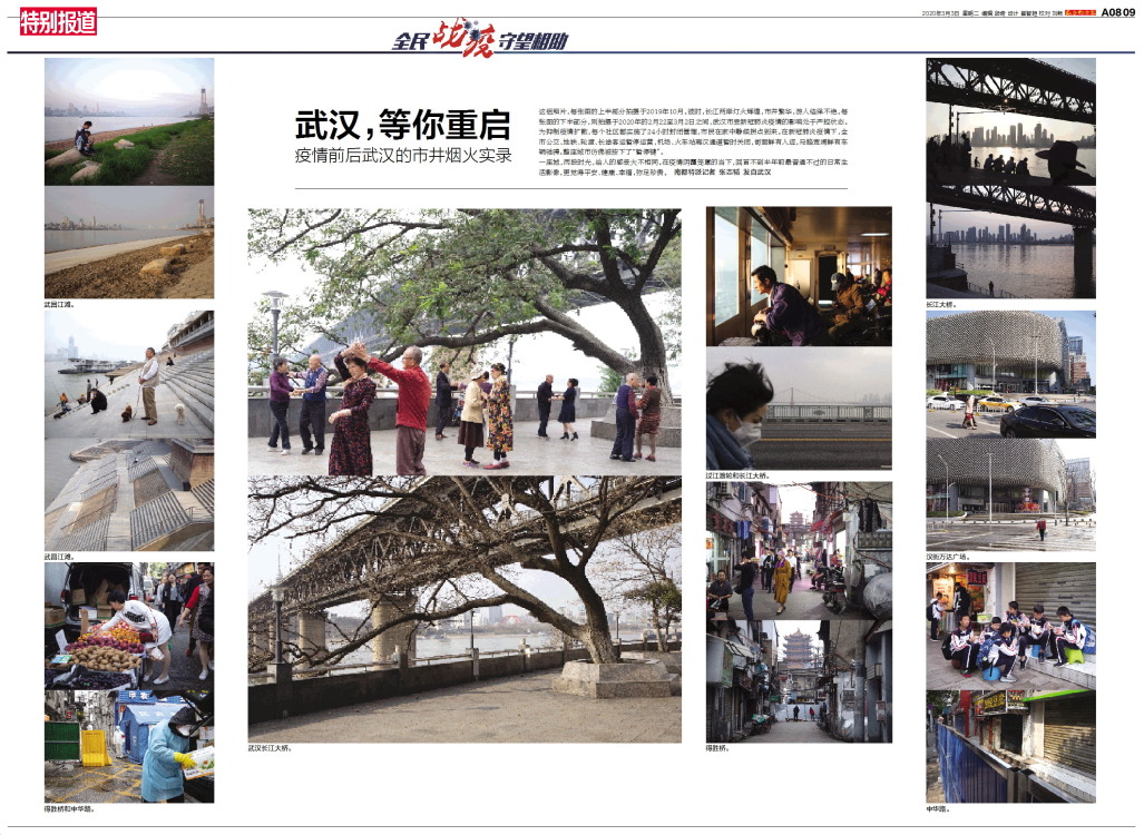 这组照片,每张图的上半部分拍摄于2019年10月。彼时,长江两岸灯火辉煌,市井繁华,游人络绎不绝。每张图的下半部分,则拍摄于2020年的2月22至3月2日之间,武汉市受新冠肺炎疫情的影响处于严控状态。