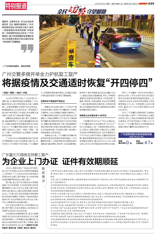 3月2日,南都记者从广东省公安厅获悉,省公安厅在前期出台的42项便民举措基础上,研究制订了三大类共20项应对新冠肺炎疫情支持企业复工复产措施,全力支持和推动受疫情影响的各类企业复工复产。据了解,省公安
