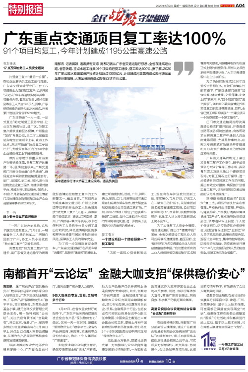 南都讯 记者蒋臻 通讯员粤交综 南都记者从广东省交通运输厅获悉,全省在建高速公路、省管铁路、重点水运工程共91个项目均已复工建设,复工率达100%。据了解,2020年广东公路水路固定资产投资计划超过1