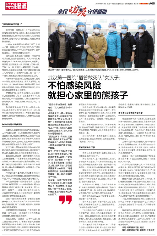 “妈妈你早点回来吧,我要吃肉!”女儿在视频中对卢凡说。卢凡是武汉市第一医院麻醉科的医生,也是医院“插管敢死队”的女队员。自2月11日医院成为收治新冠肺炎患者定点医院之后,卢凡上了一线。照顾女儿的责任全