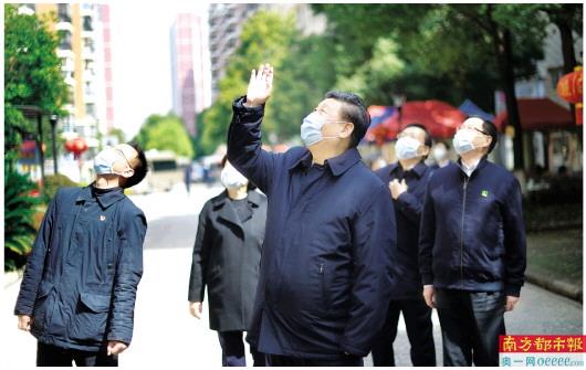 3月10日,中共中央总书记、国家主席、中央军委主席习近平赴武汉市考察新冠肺炎疫情防控工作。这是习近平在东湖新城社区考察时,向在家隔离居住的居民挥手致意、表示慰问。 新华社发
