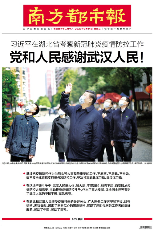 ●继续把疫情防控作为当前头等大事和最重要的工作,不麻痹、不厌战、不松劲,毫不放松抓紧抓实抓细各项防控工作,坚决打赢湖北保卫战、武汉保卫战。 ●在这场严峻斗争中,武汉人民识大体、顾大局,不畏艰险、顽强不