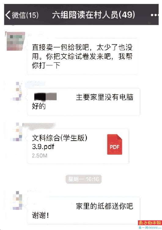 打印机、打印纸、笔记本电脑……通过微信群,这些资源得到流通共享。“大家都在互相帮忙,目前我们统计了下,组里有9户家庭有打印机,如果学生需要打印试卷,只需要十分钟,志愿者就能将试卷送到学生手里。其他一些问题,比如设备坏了、电脑坏了,都可以在群里反馈。”秦先生向南都记者介绍。