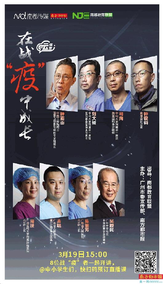 南都讯 记者梁艳燕 今天下午15:00,南都云课堂——在战“疫”中成长准时开课了。一场突如其来的疫情改变了我们的教育状态。我们虽然不返校,但生活即教育,随时随地都能成为我们的课堂。我们即将在“云”端见面了,中国工程院院士钟南山,中国教育学会副会长、广州中学首任校长吴颖民将作为这节课的主讲嘉宾,给同学们带来不一样的精彩。