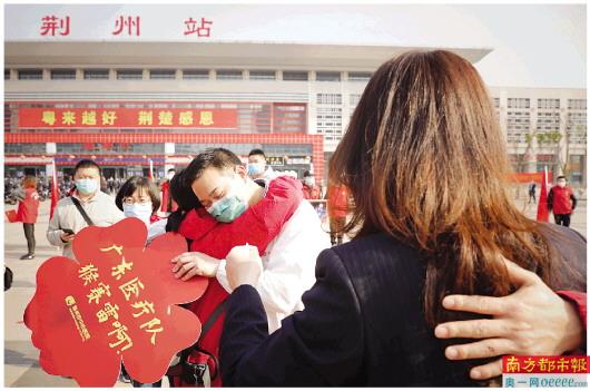 荆州站外,粤鄂两地医务人员相拥惜别。 南都特派记者 陈辉 摄