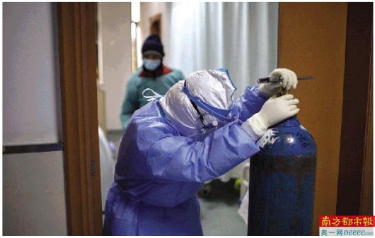 然而,整个医院一天供应80瓶氧气罐,还不能满足临床用氧。很多患者还在排队。最早很多倒下的患者,就是因为可能连吸氧的机会都没有。一个正常人血氧饱和度在97%以上,临床上呼吸功能正常的患者应当为94%以上,一旦血氧掉到这条及格线以下,就说明呼吸功能出现问题。很多患者早期血氧只有百分之五六十,如果不能及时吸氧,就会呼吸衰竭而死。“改善氧疗是当时降低死亡率的一个最重要措施。”陈爱兰说。