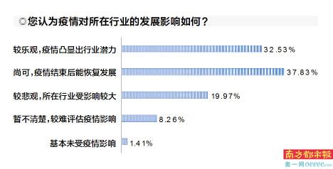 除了影响工作本身外,疫情对受访者所在的行业也有或多或少的影响。对此,近七成受访者对所在行业发展仍较为看好,其中32.53%的受访者心态乐观,认为疫情凸显出行业潜力;37.83%的受访者表示所在行业发展尚可,认为疫情结束后能恢复发展。但也有约两成的受访者持较为悲观的态度,表示所在行业受影响较大。此外,不到一成的受访者表示较难评估疫情影响,仅有1.41%的受访者表示所在行业基本不受疫情影响。