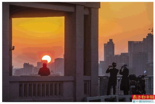3月18日,武汉长江大桥,赏日落美景的人们。