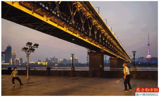 3月12日晚,在武汉长江大桥下打羽毛球的市民。