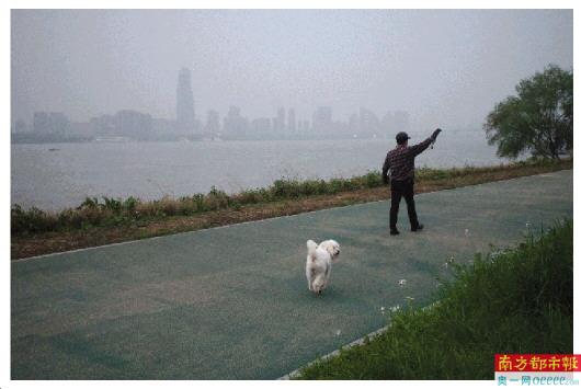 3月22日,武昌江滩,市民散着步,遛着狗。