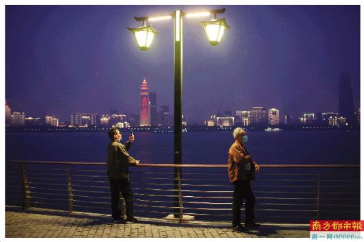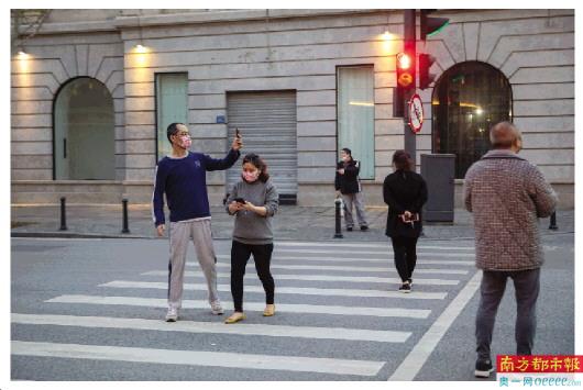 3月23日,中山大道,过马路的市民拿出手机拍摄城市夜景。