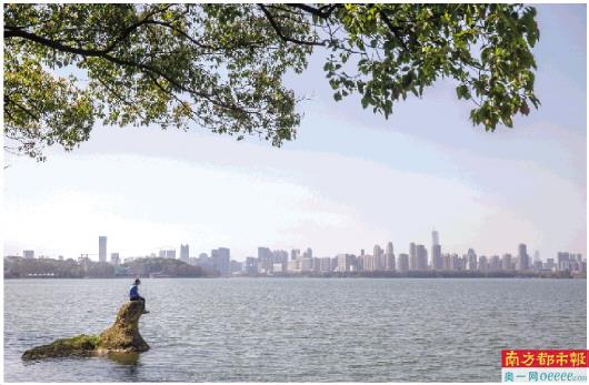 3月18日,一名戴着口罩的市民坐在东湖岸边一块石头上看风景。